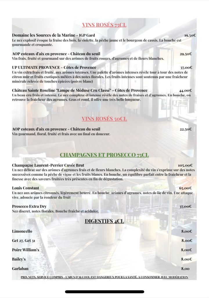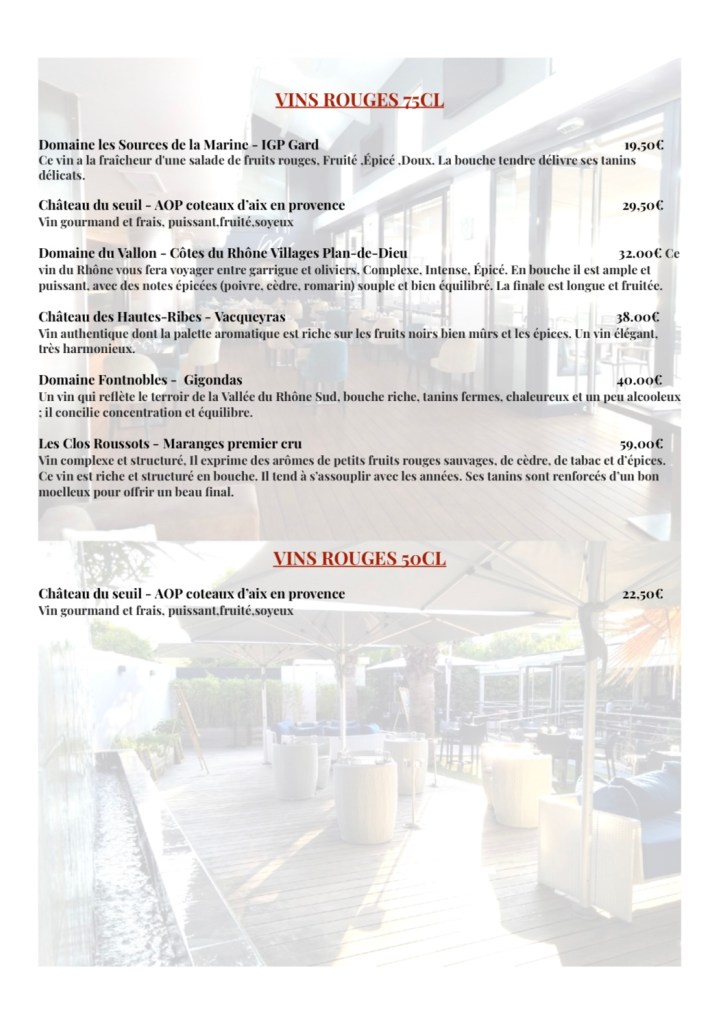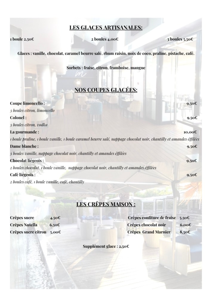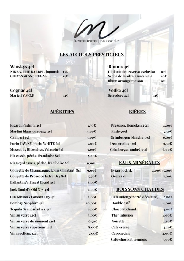 Enfin, la cave à vins de la Brasserie M accompagne vos mets par une gamme complète de vins blancs, rosés et rouges de qualité laissant place ensuite au bar à cocktails fruités et gourmands (avec ou sans alcool).