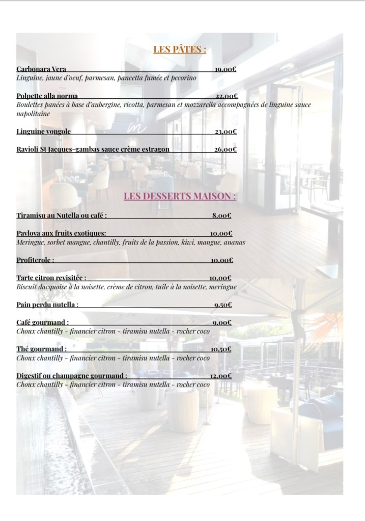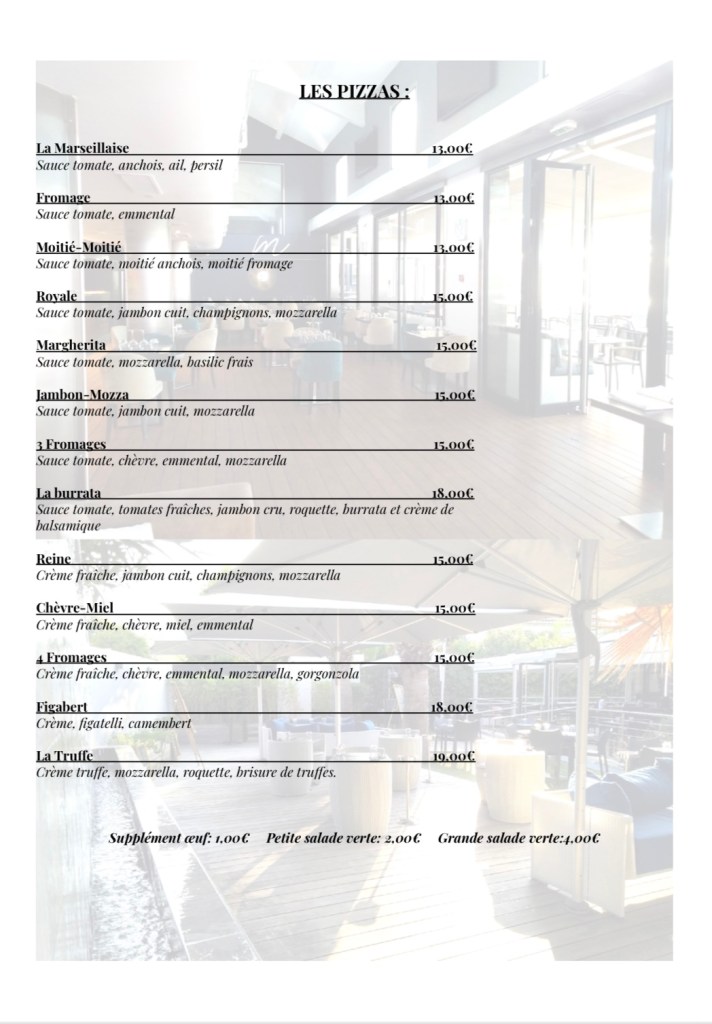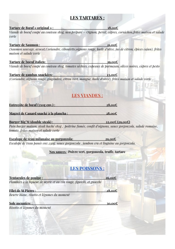 Associant cuisine locale telle que la Pizza, viandes et poissons cuits au feu de bois ou encore la salade de poulpe persillée, à une cuisine du monde telle que le wok façon thaï, le burger maison ou encore les pâtes à la génovèse, le chef n’en finit pas de prouver son savoir-faire à travers des assiettes élaborées et savoureuses.